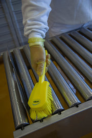 This fully color-coded, short-handled wash brush is ideal for removing stubborn dirt from conveyor belts, production lines, machinery and food preparation surfaces. It has a comfortable, ergonomic grip allowing you to work for long periods of time without hand fatigue. The stiff bristles are great for washing all types of equipment, tables and walls. You can use the brush holding both the handle and the brush head to give you better control, making for easy and effective daily cleaning. This brush is excellent for cleaning the tops of kegs and the keg coupler fitting after running through the keg washer. NOTE: This brush replaces 4190x and 4169x, both discontinued.