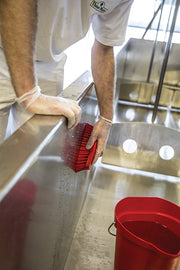 This multi-purpose angled brush has stiff angled bristles to facilitate scrubbing tables, conveyor belts, chopping boards, buckets, large scaled bowls and equipment where it is necessary to reach into corners. At the one end of the brush you have even harder filaments, which facilitates loosening more stubborn dirt.