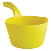 This ergonomically designed round bowl scoop is lightweight, durable and holds 32 oz. It is designed with a pouring spout on 2 sides to enable both left and right hand users to pour from the scoop. Its one-piece construction eliminates areas where bacteria can hide. Smooth surface makes it extremely easy to clean, ideal for use in food production areas for moving food ingredients, liquids etc. There is a measuring scale inside the scoop.