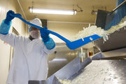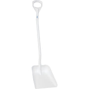 This robust, ergonomic shovel is designed for use in direct contact with food. The handle is reinforced with an inner aluminum tube. It is stepped in two places which helps to prevent back injuries. The neck joint has been strengthened in order to withstand heavy duty use. The long and large blade combination makes it suitable for shoveling large volumes.This ergonomic designed shovel reduces strain when lifting from floor level. Perfect for general food handling applications including meat, dairy, seafood and poultry.
