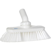 This unique brush has split fiber bristles which absorbs liquid so that the user is able to efficiently carry soapy water from bucket to wall, tank or machinery. It is soft enough to use on sensitive surfaces. The waterfed design makes is excellent for rinsing after foaming. The neck angle is adjustable, so all bristles are always in contact with the surface. Included is a white 10 ft. aluminum, telescopic extension handle and GHT (Garden Hose Thread) that allows a direct connection to a hose. Water travels from a hose through an inner tube and exits the waterfed brush. The quick connect coupling feature allows for easy attachment of a hose.