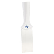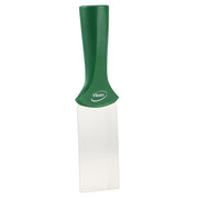 This 2" color-coded, stainless steel scraper has slightly rounded blade corners prevent damage to the surface being cleaned and operator injury. These 2" stainless steel metal food scrapers are good for removing sticky, semi-liquid deposits, like dough, confectionery gels/pastes, soft chocolate, and cheese. They are also ideal for removing dried or burnt on deposits, like hardened chocolate, caramel, dried/burnt bakery debris, dried powders, and burnt meat, fish or vegetable deposits because they enable the user to exert more mechanical force. Any Vikan Euro-threaded handle can be attached to the threaded grip, allowing cleaning of difficult to reach areas.