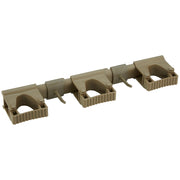 This hygienic, modular wall bracket provides a flexible solution for storing your cleaning tools and utensils in any area of your site. Proper storage of cleaning equipment enhances food safety and extends the shelf life of your equipment. These wall brackets can adjust to any color-coded program. The wall bracket comes with four rubber clips and two side hooks to hold up to 5 tools. The rail easily attaches to the four wall mounts by sliding it on from the right or left side. The grip band modules and hook modules can then be clicked on the rail and locked in place using one of the many small notches in the rail. These ensure that the modules cannot slide from side to side. From one to 10 hanging modules can be placed on the rail (up to five grip band modules or up to 10 hook modules). The system comes with three grip band modules and two hooks. Modules and rails are easy to disassemble for cleaning or replacement. See the videos tab above for an overview of how easy these are to install and configure.